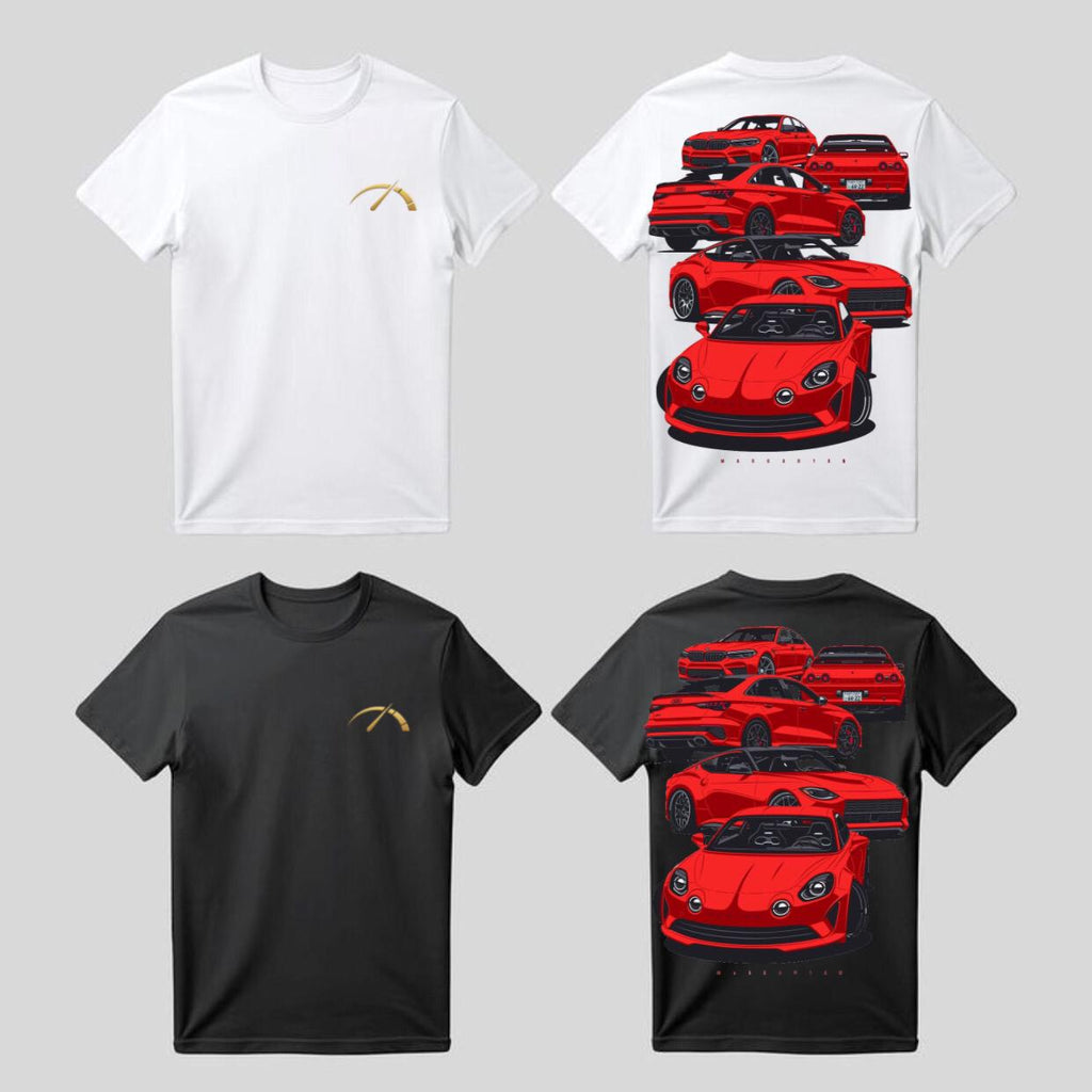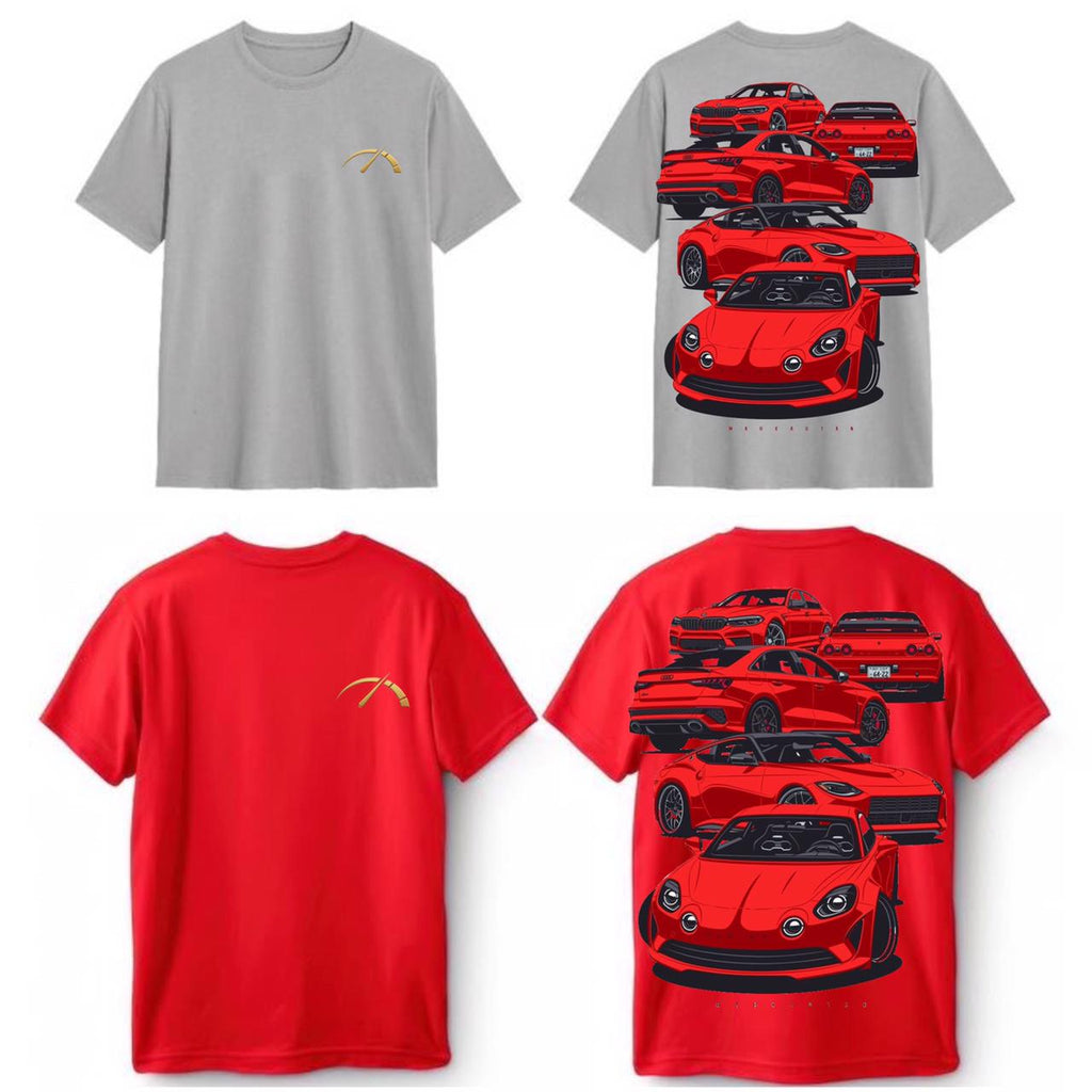 A estampa traz um conjunto de esportivos icônicos em vermelho, ilustrados com traços modernos e detalhados. A composição vertical destaca diferentes ângulos — dianteira, traseira e lateral — criando um visual dinâmico e cheio de presença.